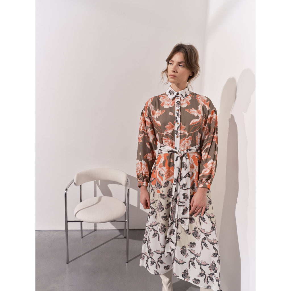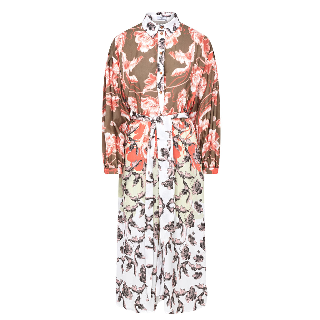Giselle High Low Hem Shirt Dress. Dropped shoulder belted dress. Crafted from lightweight and breathable viscose, this dress offers comfort and ease of wear throughout the day. The placement print design creates a visually captivating effect. With its midi length this dress strikes the perfect balance between casual and polished, making it suitable for various occasions.